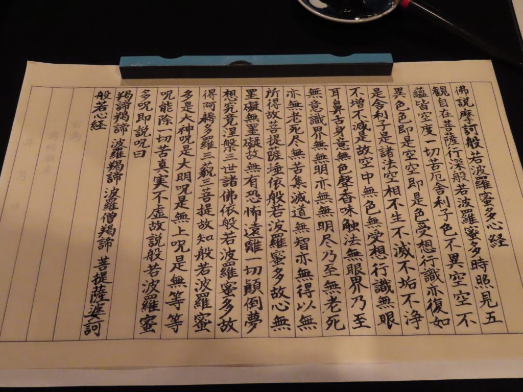 (二人は写経体験を通じて、集中し一字一字を書き進める中で心のざわつきが静まり、内面が澄んでいく感覚を得ました。雑念が消え、心が洗われたような清らかな気持ちになり、とても貴重な時間でした。)